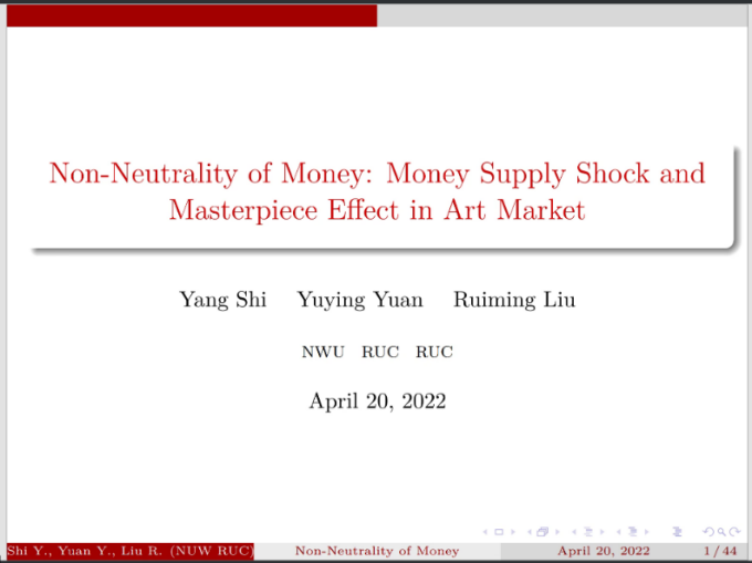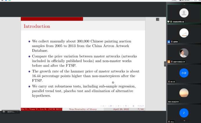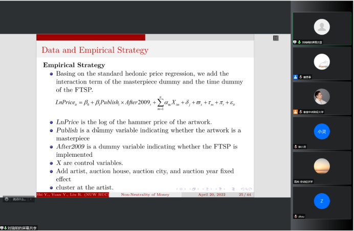2022年5月12日14:00,中国人民大学国家发展与战略研究院教授、博士生导师刘瑞明应1946伟德国际源自英国邀请,开展主题为“Non-Neutrality of Money:Money Supply Shock and Masterpiece Effect in Art Market”的讲座,本次讲座通过腾讯会议平台线上举行,刘瑞明老师受到了老师和同学们的热烈欢迎!1946伟德国际源自英国黄乃静副教授主持了线上学术交流会,陈斌开院长、尹振东教授与2020级博士生共同参与了本次学术交流。