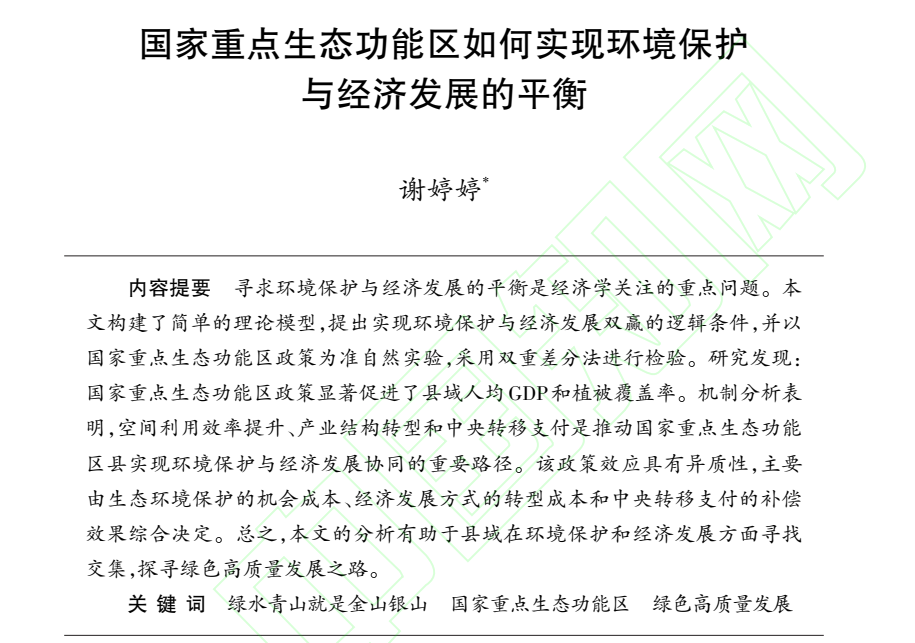 更多精彩内容请查看原文:谢婷婷.国家重点生态功能区如何实现环境保护与经济发展的平衡[J/OL].世界经济,2024,(05):34-63.
