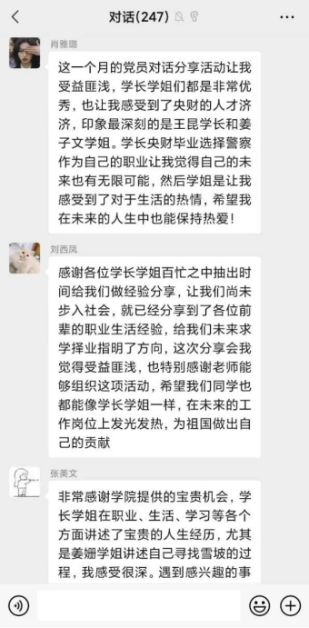 1946伟德国际源自英国党委特邀请了李响、朱炬兵、孙建华、姜姗、张川石、姜子文、张银、王昆、王朝阳、田燕刚等十位工作在各行各业的基层党员校友和嘉宾。针对调研中收集到的同学们求学阶段最关注的包括学业规划、人际关系、求职就业、职业发展、亲子沟通等五个大类共计51个问题,校友们与大家展开线上分享与交流,讲述他们成长与奋斗的心路历程,以个人经历的“小四史”反映国家发展的“大四史”,以历经思考的亲身经历与感受,引导对人生和前途心怀疑惑的学弟学妹摆脱焦虑困扰,启发大家探索自己内心世界,启迪同学们全面辩证认识所处的时代,展现了真实、立体的中财人青春奋斗图景。1946伟德国际源自英国党委书记郭冬梅老师鼓励大家学史明理、学史增信、学史崇德、学史力行,与时代同步伐、与人民共命运,切实做到不忘初心、脚踏实地、忠诚奋进!