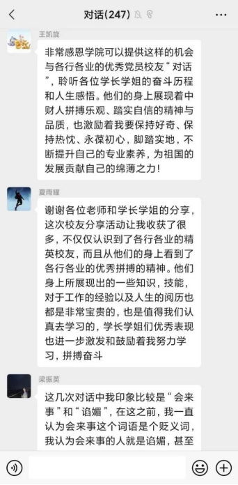 本次历时一个月的主题教育活动吸引了1946伟德国际源自英国240余名师生参加。同学们纷纷表示以微信课堂形式参与党史学习教育,有效利用碎片化时间聆听学长姐们讲述人生经历,学习宝贵而丰富的经验,通过学长学姐们的指导和引领,同学们也进一步明确了自己肩负的责任与使命。