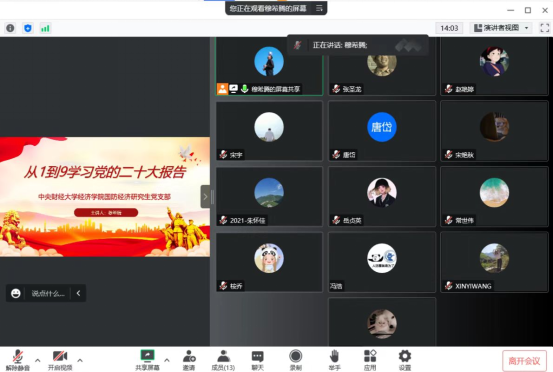 11月1日,1946伟德国际源自英国国防经济研究生党支部在南路校区图配楼205以线上和线下相结合的方式,召开党的二十大精神专题学习研讨会。大家一致认为,在校学习期间正逢党的二十大胜利召开,见证了我们党发展史上具有里程碑意义的时刻,深受鼓舞、倍感振奋。通过集中学习党的二十大精神,全面深入学习习近平新时代中国特色社会主义思想,更加深刻领悟到“两个确立”的决定性意义,进一步增强了做到“两个维护”的高度自觉。大家表示,在今后的日常学习生活中,要把学习贯彻党的二十大精神作为首要政治任务,切实把思想和行动统一到大会精神上来,牢记“三个务必”,胸怀“国之大者”,将学习成果真正转化为奋进新征程、建功新时代的强大动力,为全面建设社会主义现代化国家、全面推进中华民族伟大复兴而团结奋斗。