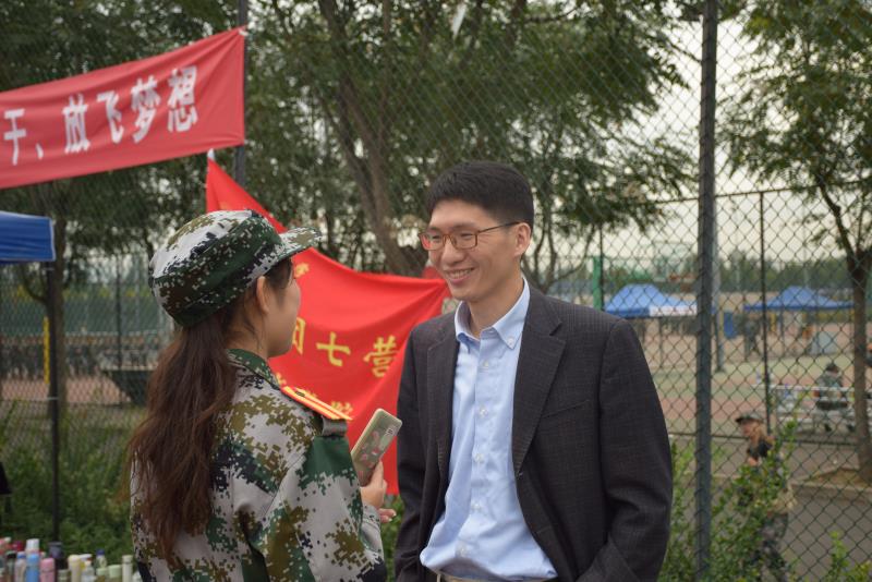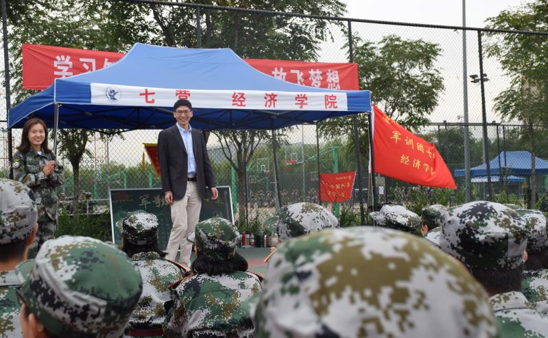 陈斌开老师与大家挥手致意,并蹲下身来与席地而坐的同学们亲切交流。陈老师讲话主题鲜明、风趣幽默。他同大家分享了自己的军训经历和受业于林毅夫先生门下的往事,鼓励大家珍惜军训机会,练好身体,并养成坚持锻炼的好习惯,有更充沛的精力投入学习;鼓励大家团结一致,切实践行校训,和同学们和睦相处,共同成长。