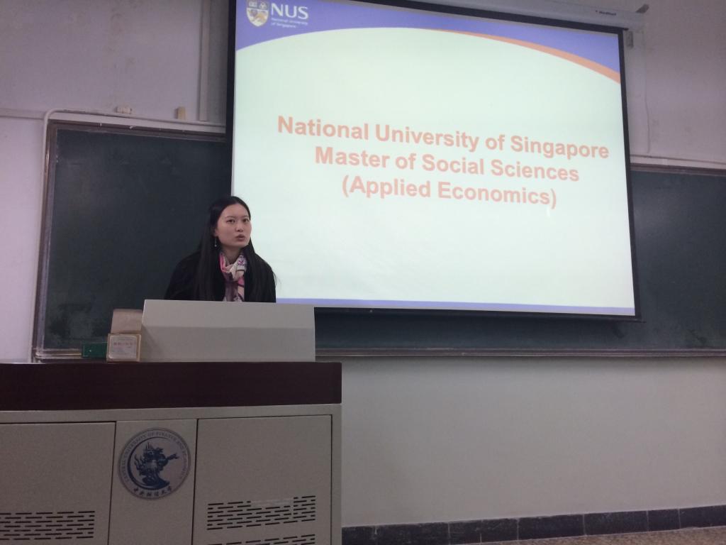 1026日、27日,为了促进我院及我校毕业生的出国深造工作,提升出国深造的平台与水平,应我院邀请,新加坡国立大学应用经济学硕士项目招生负责人韦青老师来到我校进行项目宣讲。