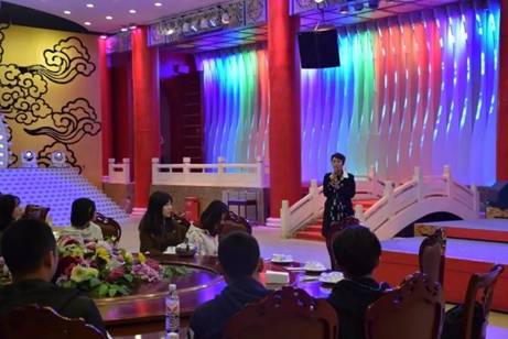 下午3点半,同学们到达目的地,参观活动正式开始。飞乐音响副总裁赵海茹带领同学们进入主会场,伴随着一曲北京欢迎你,会场大门缓缓拉开,整个宴厅映入眼帘。灯光伴随着动感的音乐、气势磅礴的鼓声、抑扬顿挫的的京剧唱腔而变换出不同色彩,造型各异,色彩缤纷,十分壮观,真可谓一场视觉与听觉的盛宴。紧接着放映了飞乐音响宣传片,同学们了解了公司的创建和成长发展史,感受了大企业浓厚的企业文化,见识到了现代化的设备、自动化的操作、高科技的应用。同时,智慧城市、智慧路灯的设想让同学们感到新奇和震撼。
