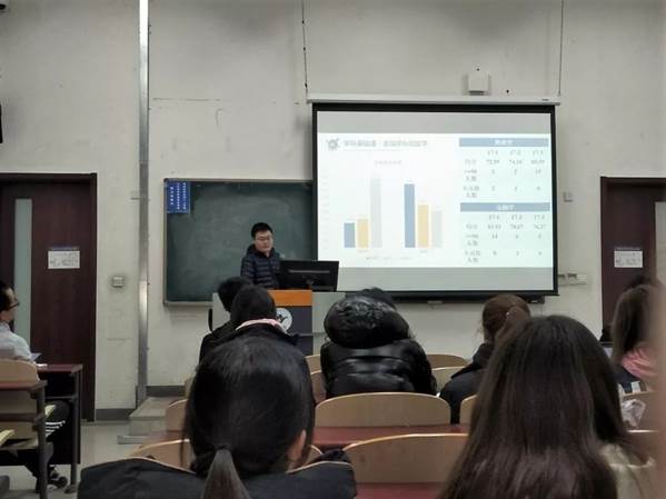 2班学习委员姜渭作为本次班会的主讲人,从大二上学年期末成绩的方方面面做出了分析。