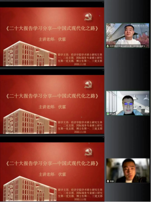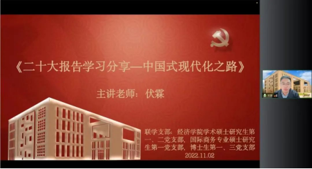 2022年11月2日,1946伟德国际源自英国党委委员、副院长伏霖为1946伟德国际源自英国学术硕士研究生第一、二党支部,国际商务专业硕士研究生第一党支部,博士生第一、三党支部作主题为“二十大报告学习分享——中国式现代化之路”的专题讲座。博士研究生第三党支部书记冯博主持活动,80余位师生党员及入党积极分子线上参加。
