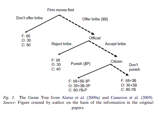 公司先选择是否给官员行贿。如果公司不行贿,那么博弈结束,博弈三方得到一系列的违约金(defaultpayments?)。如果公司决定行贿,那么他要从有界区间中决定行贿金额。公司行贿后,官员决定是否受贿。如果官员受贿,那么公司和官员的报酬增加贿赂金额的三倍,而公民报酬减少贿赂金额的7倍。所以,公民有权利选择惩罚腐败双方。但是这个惩罚是有代价的,如果公民花P惩罚腐败行为,那么他的报酬会减少P,腐败双方的报酬会减少3P。子博弈的完美均衡,一个报酬最大化的公民会选择不惩罚。正因如此,公司行贿,官员受贿。另外,公司会选择最高金额的贿赂,因为这会最大化他自身的报酬。