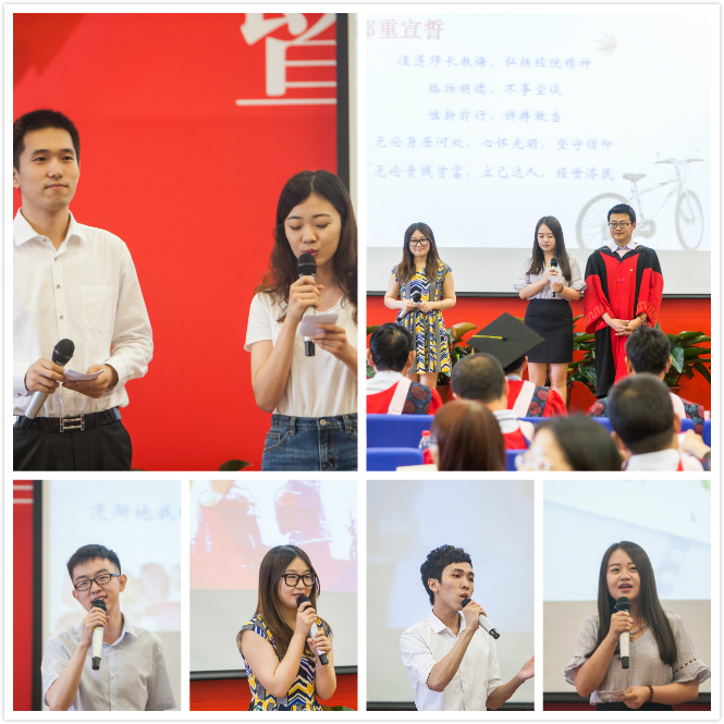 毕业的喜悦掺杂着离别的忧伤,对往日时光的回忆与对未来生活的期盼是毕业生最真的情感。经济学12级本科生以“青春之歌”为题,用朗诵来告别“爱人们”,“在最急最美的时光里,我们的遇见却是如此美丽”;国民经济管理12级本科生以日记的片断回顾他们光阴的故事,“2012年9月1日,晴,开始了大学生活……2016年6月24日晴,我们毕业了”,为老师献上自制的《青春纪念册》,再一次唱起“我们虽然人不算多”的班歌……。2014级硕士毕业生则在相互赠送的书签里留下了彼此间最真诚的祝福,同时为老师呈上了“私人订制”感恩答谢贺卡。毕业时刻,感念师恩,每个毕业班都用自己的表达方式阐述了“经院予我,时光予你”的特殊意义。之后,在93名硕士毕业生的倡议下,学院2016届202名本硕博毕业生面向恩师、面向亲友、面向自己郑重承诺,庄严宣誓“谨遵师长教诲,弘扬经院精神,格物明德,不事空谈,惟新前行,拼搏敢当,无论身居何处,心怀光明,坚守信仰,无论贵贱贫富,立己达人,经世济民”。