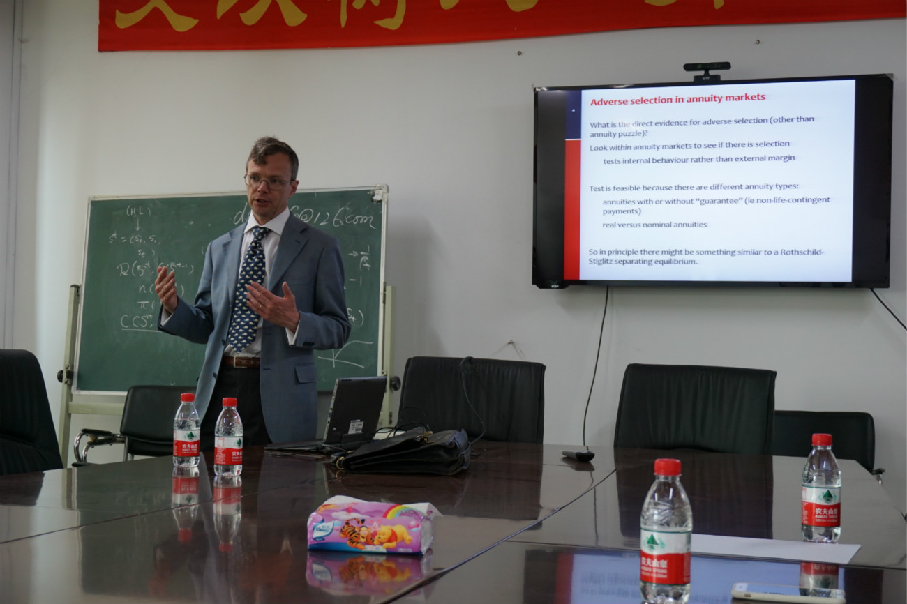 Cannon博士从一个新颖的角度思考了年金市场的逆向选择问题,以其翔实的论据,精湛的分析,生动的讲解为广大师生呈现了一场精彩的讲座,极大的激发了大家进行相关研究的兴趣。报告之后,参加讲座的学生就讲座相关的问题同Cannon博士进行了深入而热烈的交流。