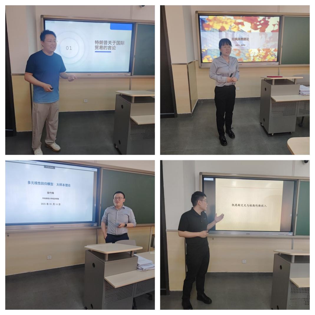 比赛阶段,吴楠、田子方、徐竹烽、顾诗骏分别就自己的主讲课程进行了教学演示,内容涵盖微观经济学、宏观经济学、计量经济学等课程。四位教师准备充分,教态自然,充分展现了我院青年教师的风采。伴随着比赛的进行,评审嘉宾也做出了精彩点评,并提出建设性意见。