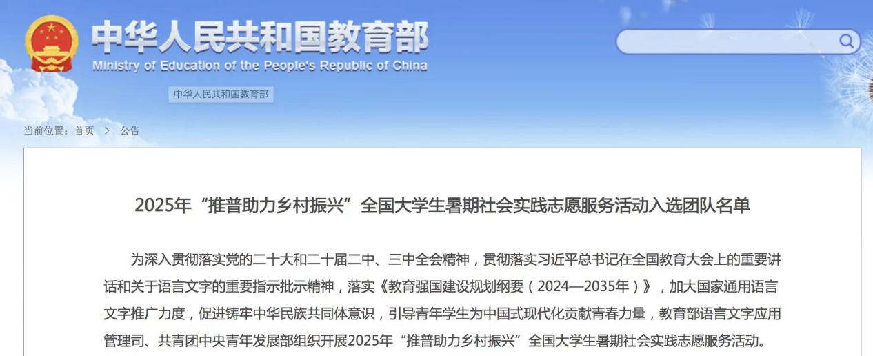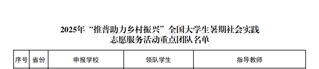 2025年7月4日,教育部公布了2025 年“推普助力乡村振兴”全国大学生暑期社会实践志愿服务活动入选团队名单。1946伟德国际源自英国1支团队入选重点团队,3名教师作为重点团队指导教师。