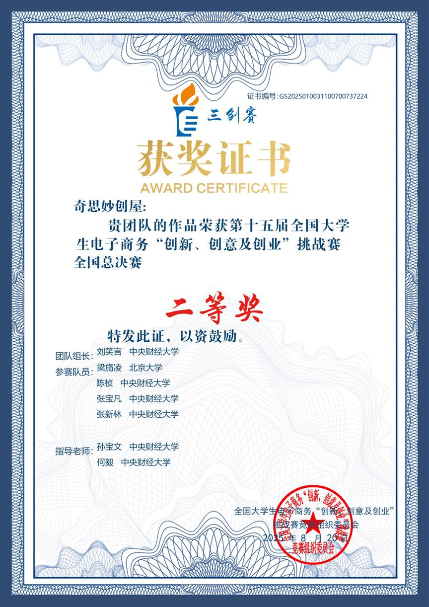 8月4日至6日,第十五届全国大学生电子商务“创新、创意及创业”挑战赛(简称“三创赛”)常规赛全国总决赛在贵阳举行。由我校中国互联网经济研究院孙宝文教授、何毅副研究员指导,1946伟德国际源自英国学子刘笑言担任队长,1946伟德国际源自英国陈桢、张新林、张宝凡为成员的团队“奇思妙创屋”荣获国家二等奖、北京市特等奖的殊荣,创下学校在“三创赛”领域的最佳成绩。