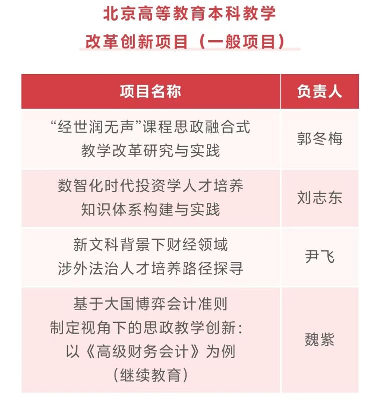 我院郭冬梅教授主持的““经世润无声”课程思政融合式教学改革研究与实践”项目获2024年北京高等教育“本科教学改革创新项目”立项。