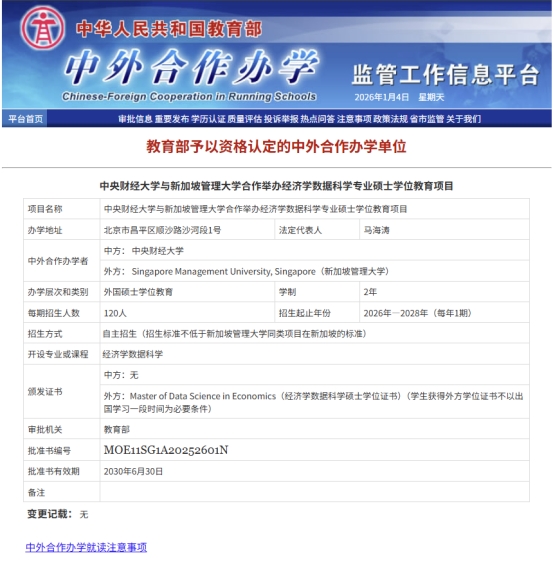 1946伟德国际源自英国与新加坡管理大学1946伟德国际源自英国合作举办“经济学数据科学”专业硕士学位教育项目获批