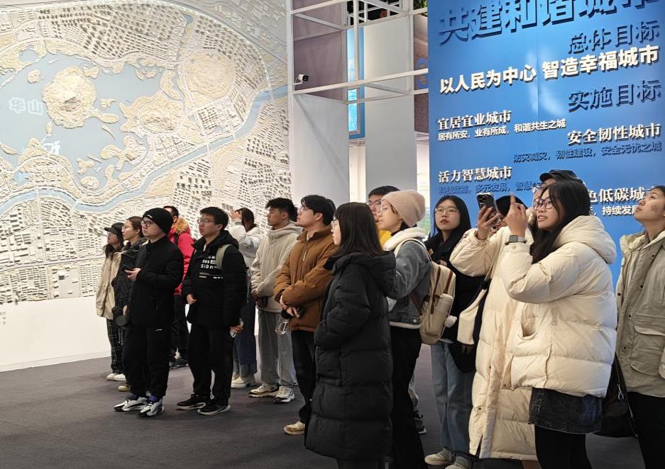 活动过程中,大家依次参观三大主题展区以及室外展区,认真观看项目视频介绍,聆听技术和产品讲解。在 “助力中国建造” 展区,智慧工厂内远程驾驶智能集控数字塔机与高端玻璃幕墙智能制造工厂,呈现生产方式智能化变革;智慧工地的智能安全帽及物联网智能安全管理系统保障施工安全,“空中造楼机”、北斗卫星定位装备等彰显自主创新精神。“共建和谐城市” 展区,济南中海华山、西安幸福林带城市绿廊等项目体现花园城市建设探索,城市慢行系统与生命线运营管理平台展现数智赋能。“拓展幸福空间” 展区,自清洁辐射制冷材料、盾构渣土资源化利用技术等体现绿色低碳与智能安全理念,“好房子” 样板间融合高科技实现 “高性能” 与 “好体验” 完美融合。外部展厅的高海拔增压建筑、模块化酒店产品等也让师生直观感受建筑业转型升级之路。